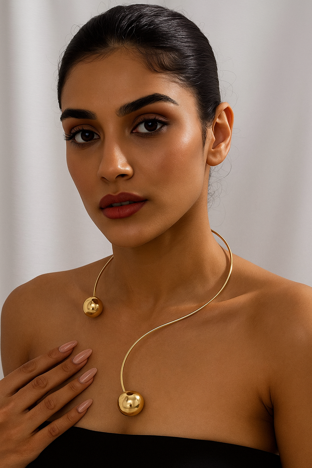 Ball Statement Necklace is a bold and striking piece of jewelry that features large, round ball-shaped elements as its main focal point. These balls can be made from various materials like metal, glass, resin, or gemstones, and they can be arranged in a single strand or layered in multiple rows for a more dramatic effect. The balls may be smooth, textured, or even embellished with crystals or patterns, adding an extra layer of intrigue to the design.