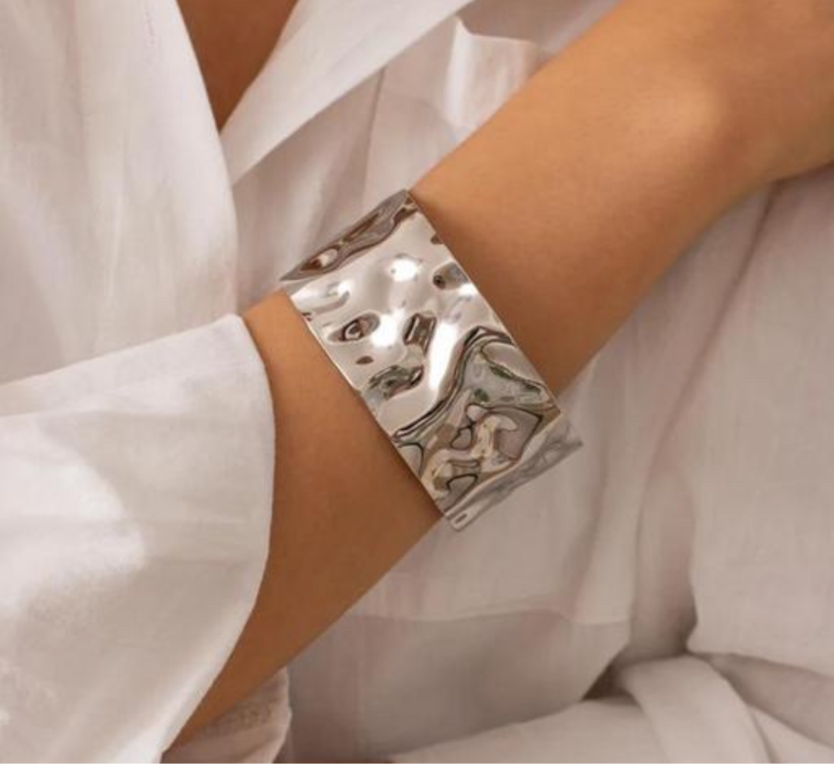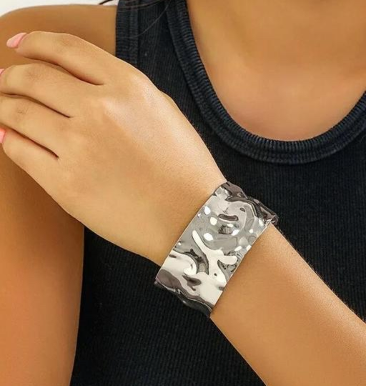 The hand cuff style of the bracelet is often a wide, open cuff that wraps around the wrist with minimal or no clasp, making it easy to slip on and off. The beaten texture adds depth and dimension, giving the bracelet a bold yet understated appearance. It can be worn alone for a minimalist look or stacked with other bracelets for a more layered, bohemian style.