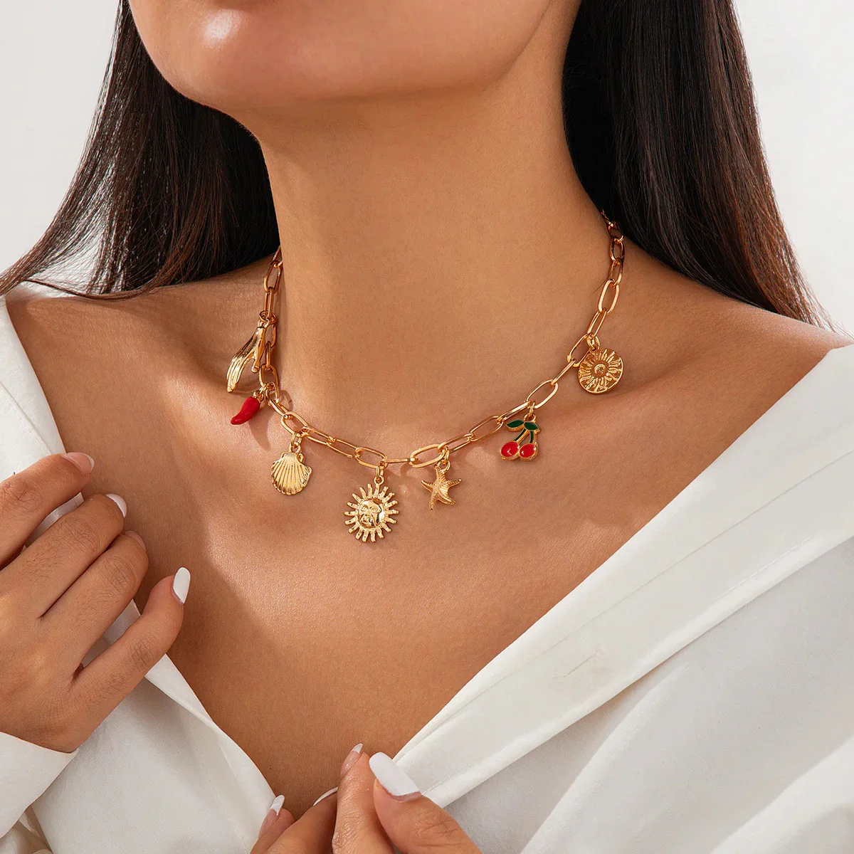 Size & Placement: You could have a few large charms of cherries and chili peppers clustered together, or distribute smaller versions evenly along the chain for a more balanced look.