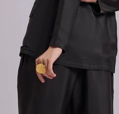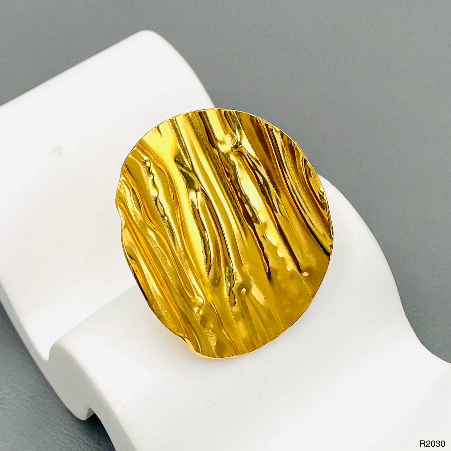 A dented golden ring is a modern and textured piece of jewelry, featuring a gold band with subtle indentations or dimpled details across its surface. The "dented" effect is typically achieved through hammering or embossing, which adds an organic, rugged look to the smoothness of the gold. This design creates a visually interesting texture that contrasts with the usual polished, sleek appearance of traditional gold rings. The dented golden ring can be worn as a statement piece on its own or paired with other rings for a layered effect. It’s perfect for those seeking a blend of elegance and contemporary edge in their jewelry.