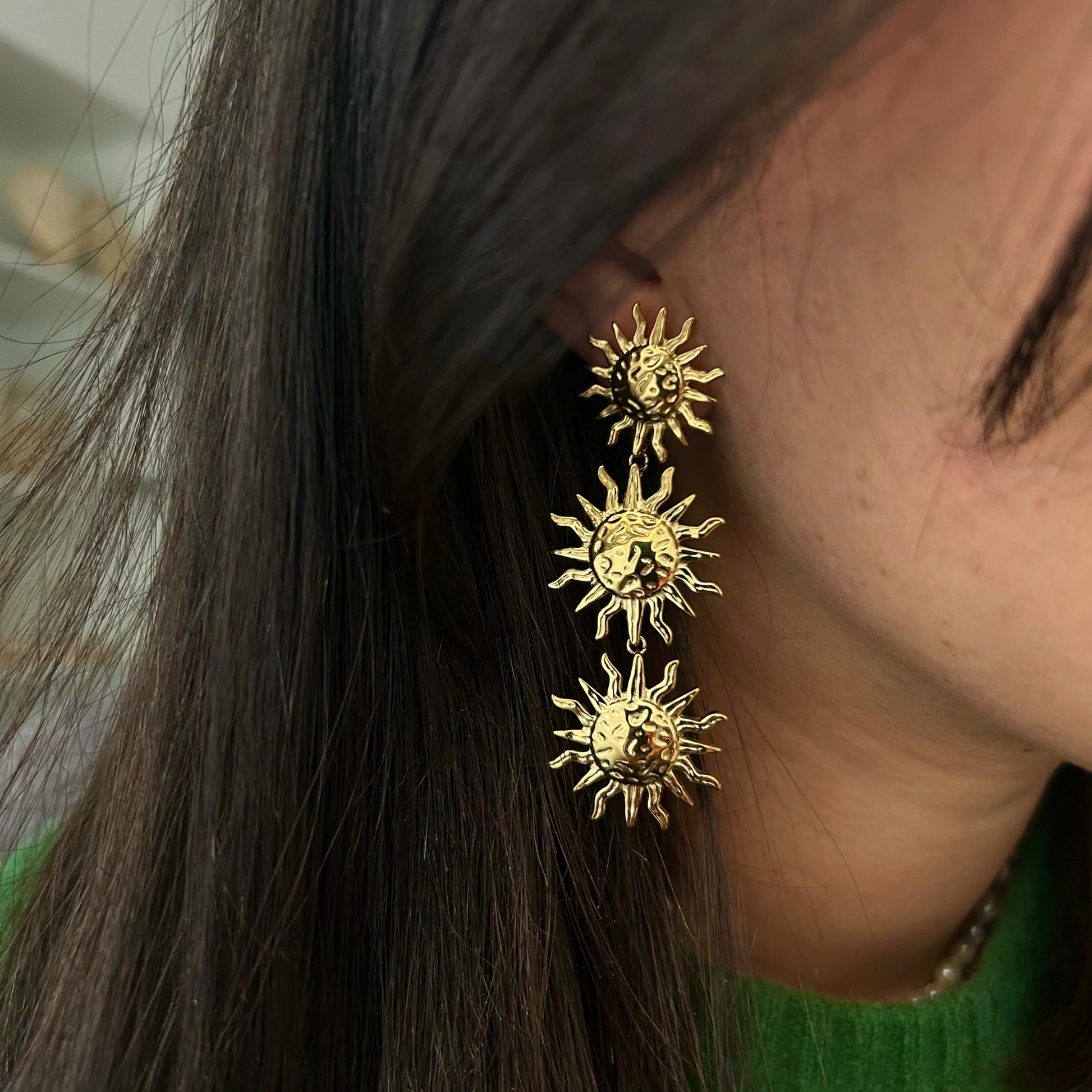 Illuminate your look with the Dropping Sun Dangler earrings, a statement piece inspired by the radiant beauty of the sun. These exquisite earrings feature a cascading trio of sun motifs, each intricately designed with a textured, hammered finish for a luxurious and artisanal touch. Crafted in a high-shine gold-tone metal, they exude elegance and warmth, making them perfect for both casual chic and evening glam. Lightweight yet bold, these danglers are a must-have for those who love celestial-inspired jewelry with a modern twist.