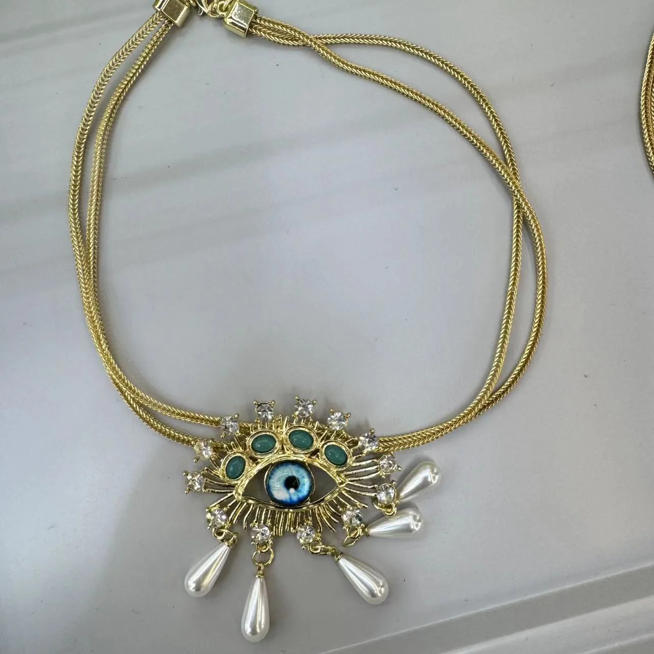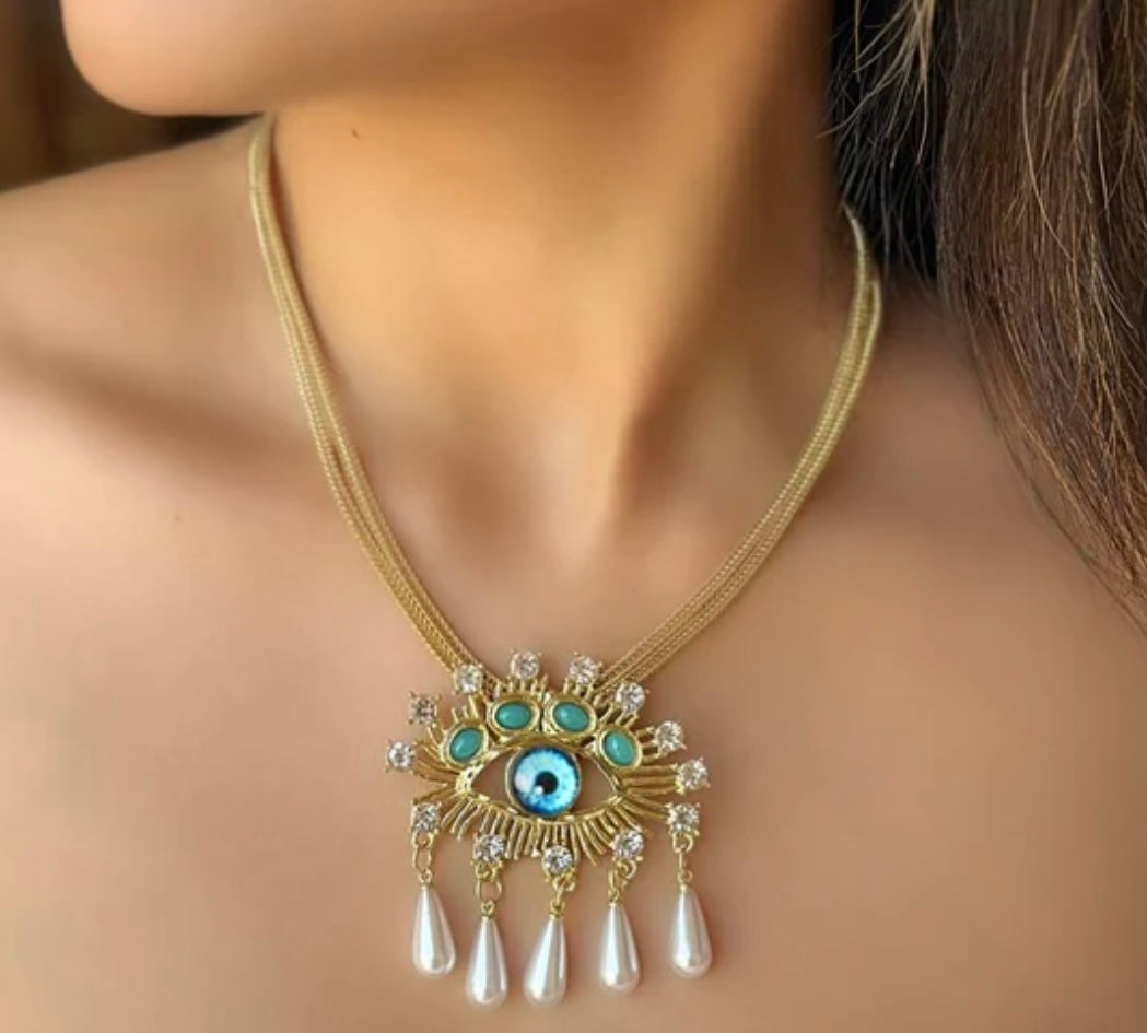 The pearls add a timeless, luxurious element to the piece, and the evil eye symbol brings a layer of meaning, often in the form of blue or turquoise colors. This necklace would be perfect for someone seeking both a meaningful and stylish accessory.