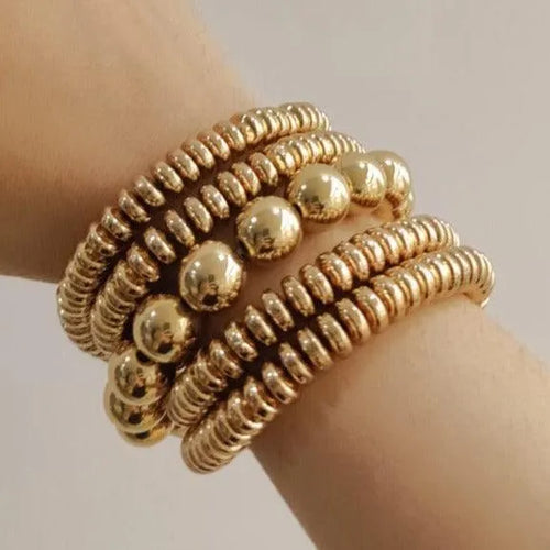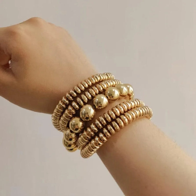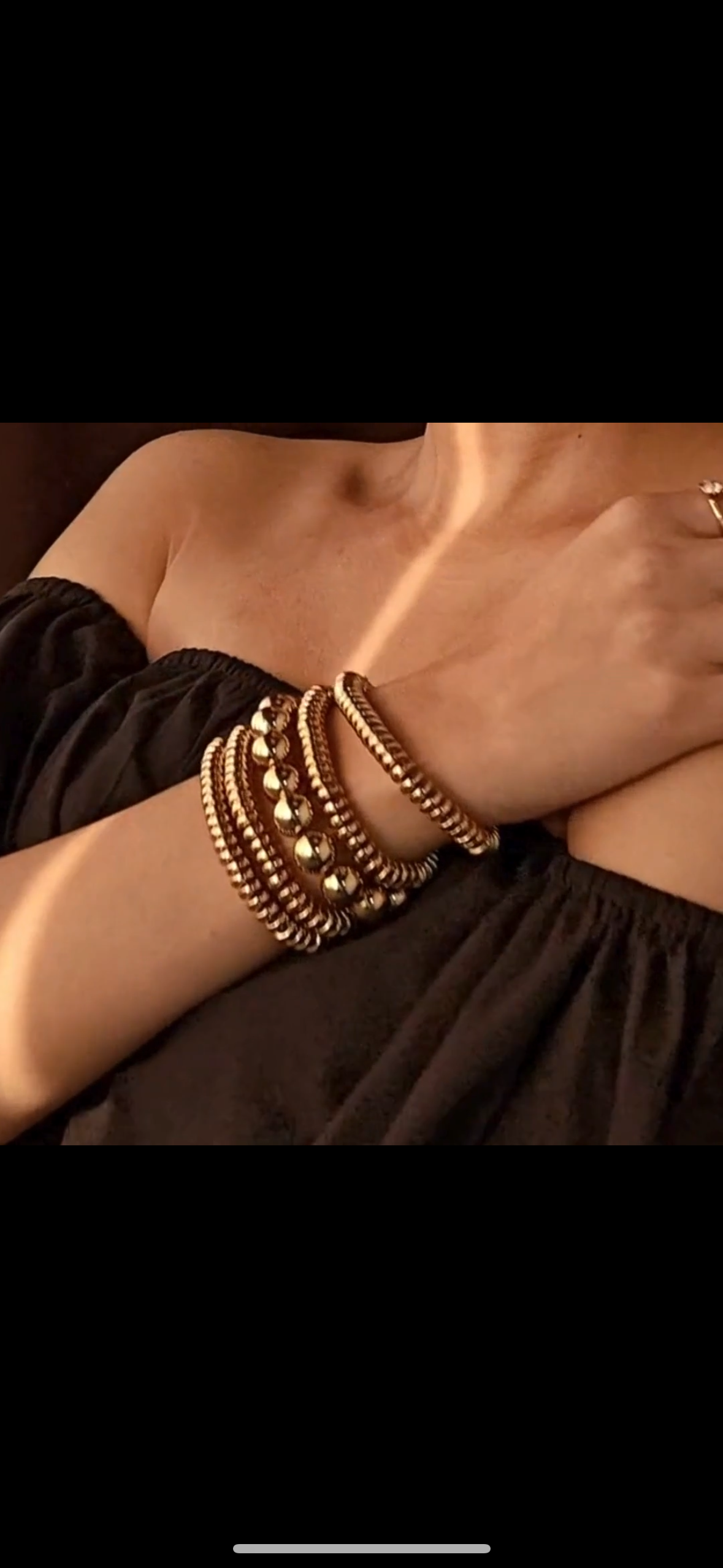 A golden bracelet stack typically refers to wearing multiple gold bracelets together on one wrist to create a layered, stylish look. This trend is all about mixing different styles, widths, and textures to make a statement.