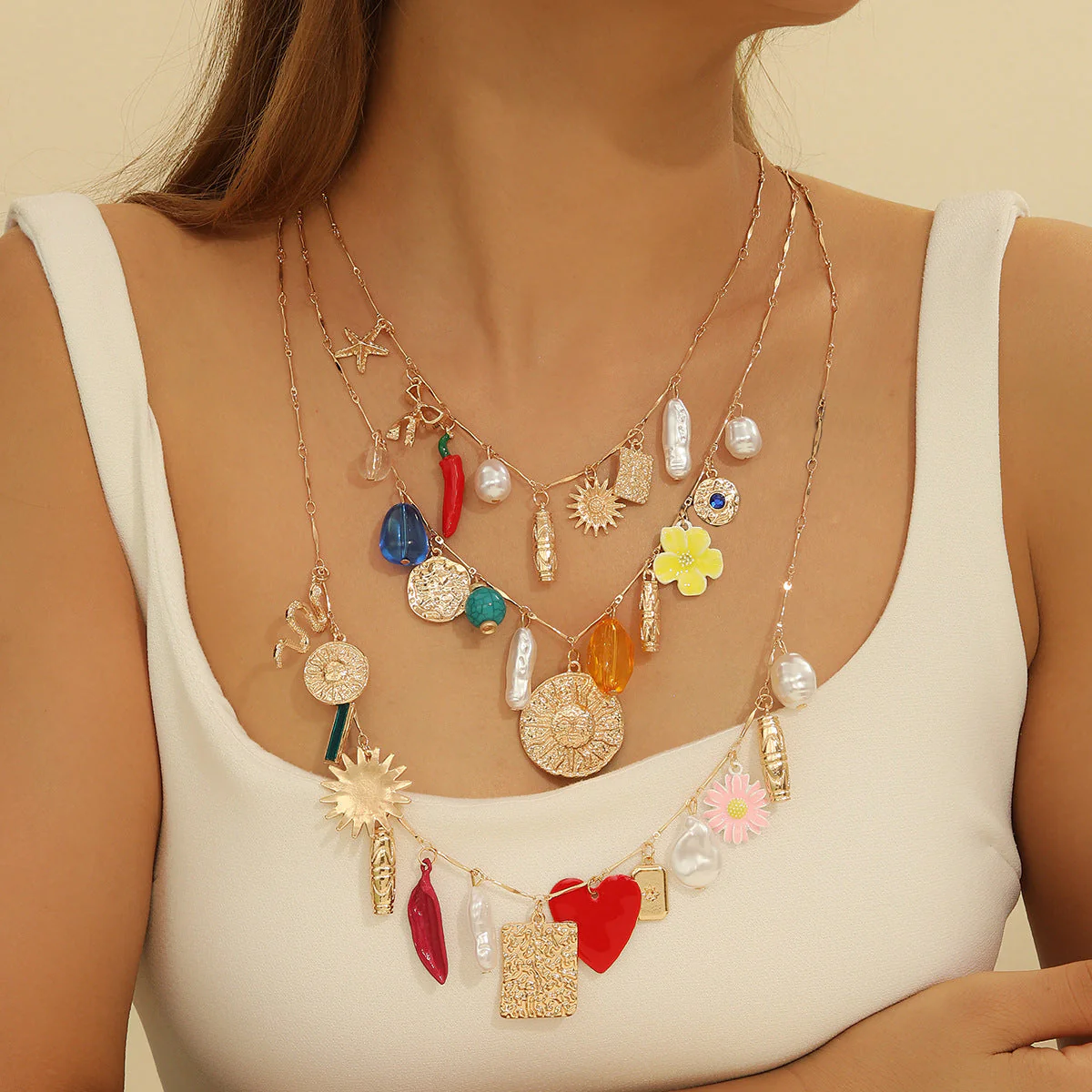 A multi-charm necklace is a trendy piece of jewelry featuring a chain adorned with multiple decorative charms or pendants. These charms can vary in shape, size, and design, often representing different symbols, motifs, or personal interests, such as hearts, stars, gemstones, or animals. The charms are usually spaced along the chain, creating a playful and layered look. Multi-charm necklaces offer a unique, personalized touch, as the wearer can choose charms that reflect their personality or style. These necklaces are versatile, perfect for both casual and more dressy outfits, and can add a fun and eclectic vibe to any look.