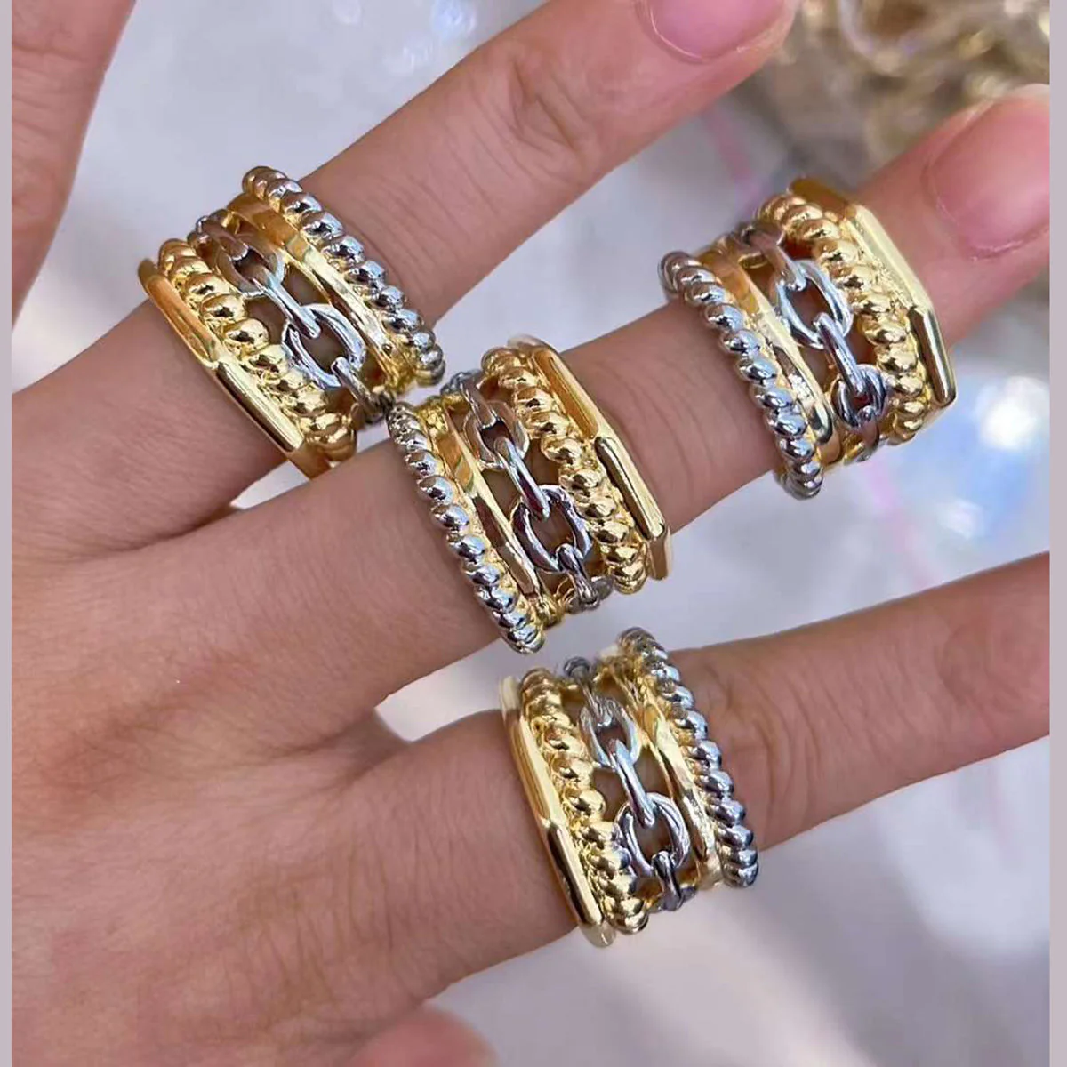 The MultiColor Link Ring is a bold and dynamic piece that adds a pop of color to any outfit. Featuring interlocking links in a variety of vibrant hues, this ring creates a striking visual impact with its playful yet sophisticated design. Crafted from high-quality metals, such as sterling silver or gold, the colorful links are made from enamel or gemstones, ensuring durability and brilliance. The adjustable design allows for a perfect fit, while the unique link pattern gives the ring a modern, eye-catching look. Ideal for those who love to mix and match colors, the MultiColor Link Ring is the perfect accessory to make a statement and add a burst of personality to your jewelry collection.
