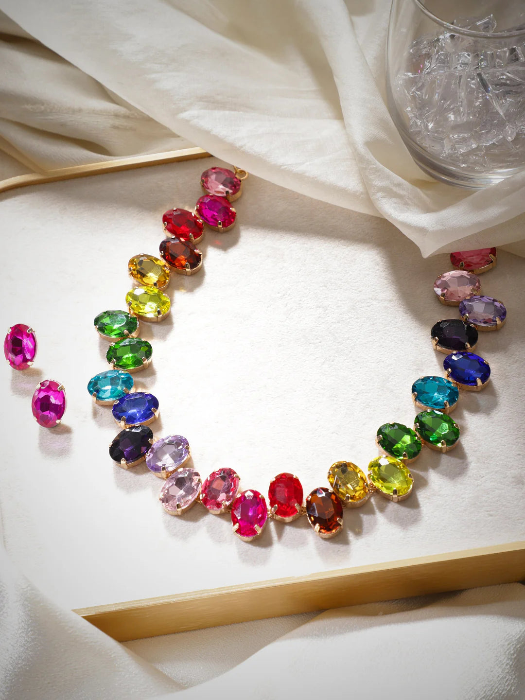 A Crystal Necklace and Earrings Set is a luxurious and elegant jewelry ensemble that typically features sparkling crystals as the main focal point. The necklace often consists of a chain adorned with dazzling crystals, either set in a symmetrical pattern or designed to create a bold statement. The accompanying earrings are usually designed to match the necklace, often in the form of drop earrings, studs, or chandelier styles, all featuring the same crystals to create a cohesive look.
