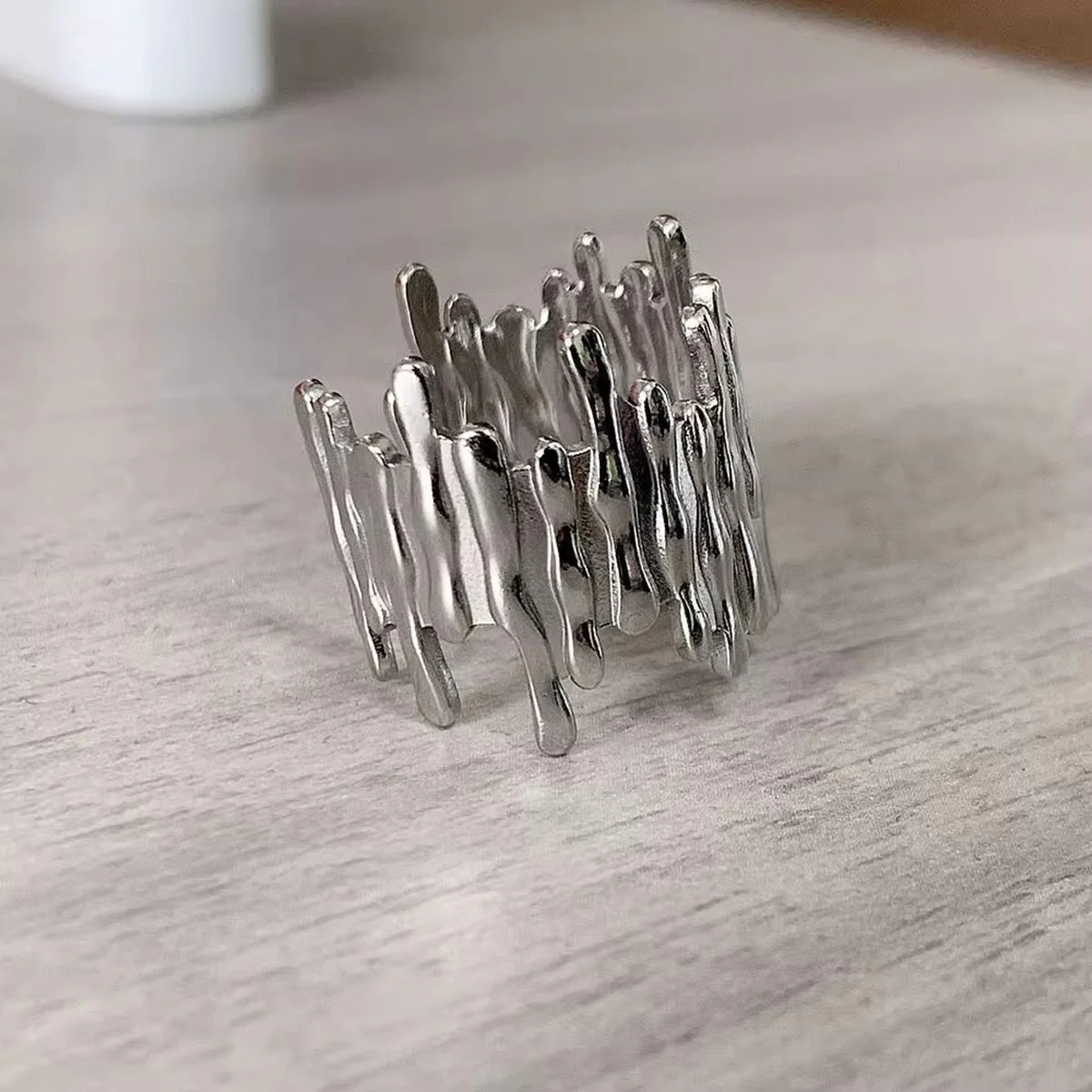 A "Melted Shape Ring" typically refers to a ring designed with a fluid, organic look, as if the material (usually metal) has been melted and reformed. The design often features uneven, dripping, or warped edges that give the ring a soft, almost liquid-like appearance. This style can evoke a sense of imperfection or spontaneity, making it feel unique and artistic.