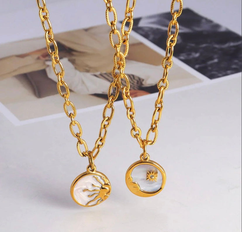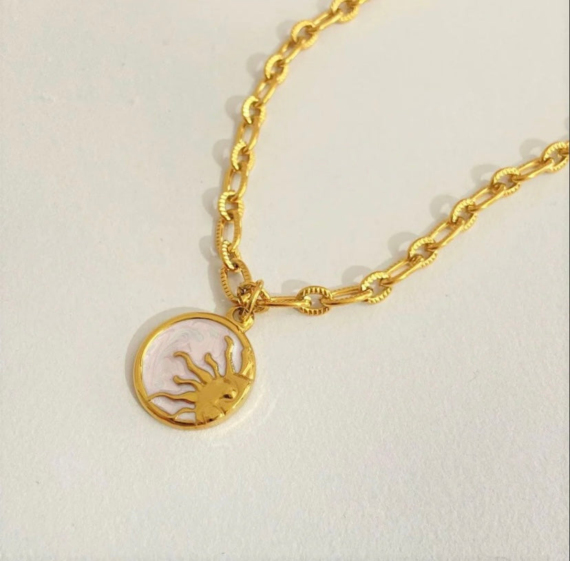 A sun pendant necklace is a radiant and symbolic piece of jewelry that features a pendant shaped like the sun. The sun represents energy, vitality, life, and growth, making this necklace a powerful and meaningful accessory. The pendant can be crafted from various metals like gold, silver, or rose gold, and may be adorned with gemstones such as diamonds, citrine, or amber to add extra shine and warmth. The design can range from simple and minimalist, with a smooth, circular sun shape, to more detailed styles with rays, texture, or intricate patterns. This necklace is perfect for those who want to carry a reminder of positivity, strength, and light, making it an ideal gift or personal accessory for any occasion.