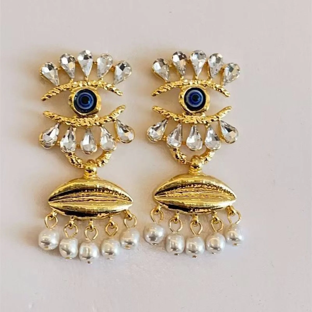 Protective, elegant, and effortlessly chic, the Evil Eye Earring combines ancient symbolism with modern luxury. Adorned with shimmering crystals and delicate pearls, this earring captures the timeless mystique of the evil eye, believed to offer protection against negative energy. The intricate design features a striking evil eye motif, beautifully accented by radiant crystals and lustrous pearls, making it a standout accessory for any occasion. Whether you're looking for a meaningful piece or simply a statement earring, this design is the perfect blend of style and symbolism.